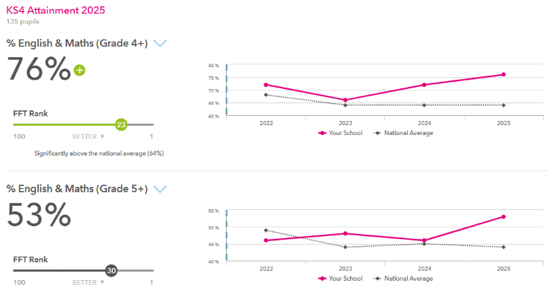 The 4+ English and Maths pass rate has risen to be 11.8% above national from 0.7% above in 2023 and is now 6% higher than the regional rate from being under by 5.1% in 2023.